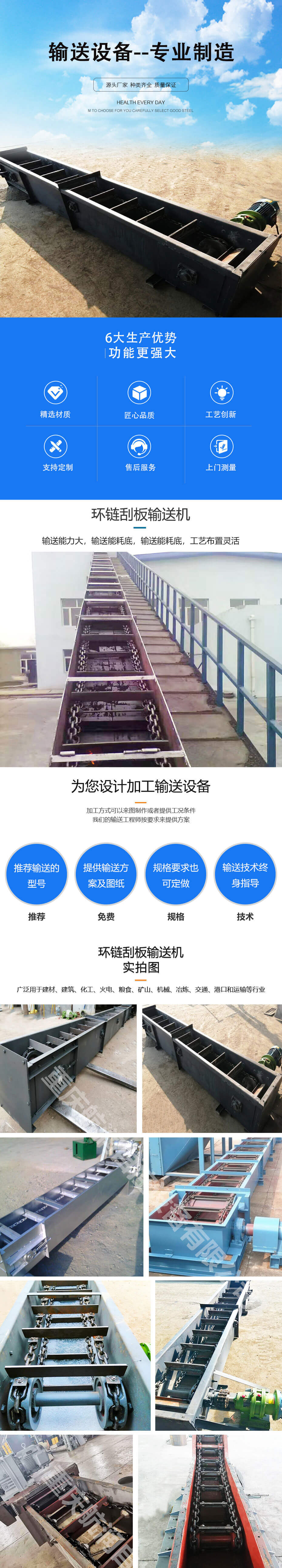 環(huán)鏈刮板輸送機(jī)輸送能力大、能耗底、密封性好、安全環(huán)保、運(yùn)行可靠、使用壽命長(zhǎng)、工藝布置靈活,廣泛用于建材、建筑、化工、火電、糧食、礦山、機(jī)械、冶煉、交通、港口和運(yùn)輸?shù)刃袠I(yè)。